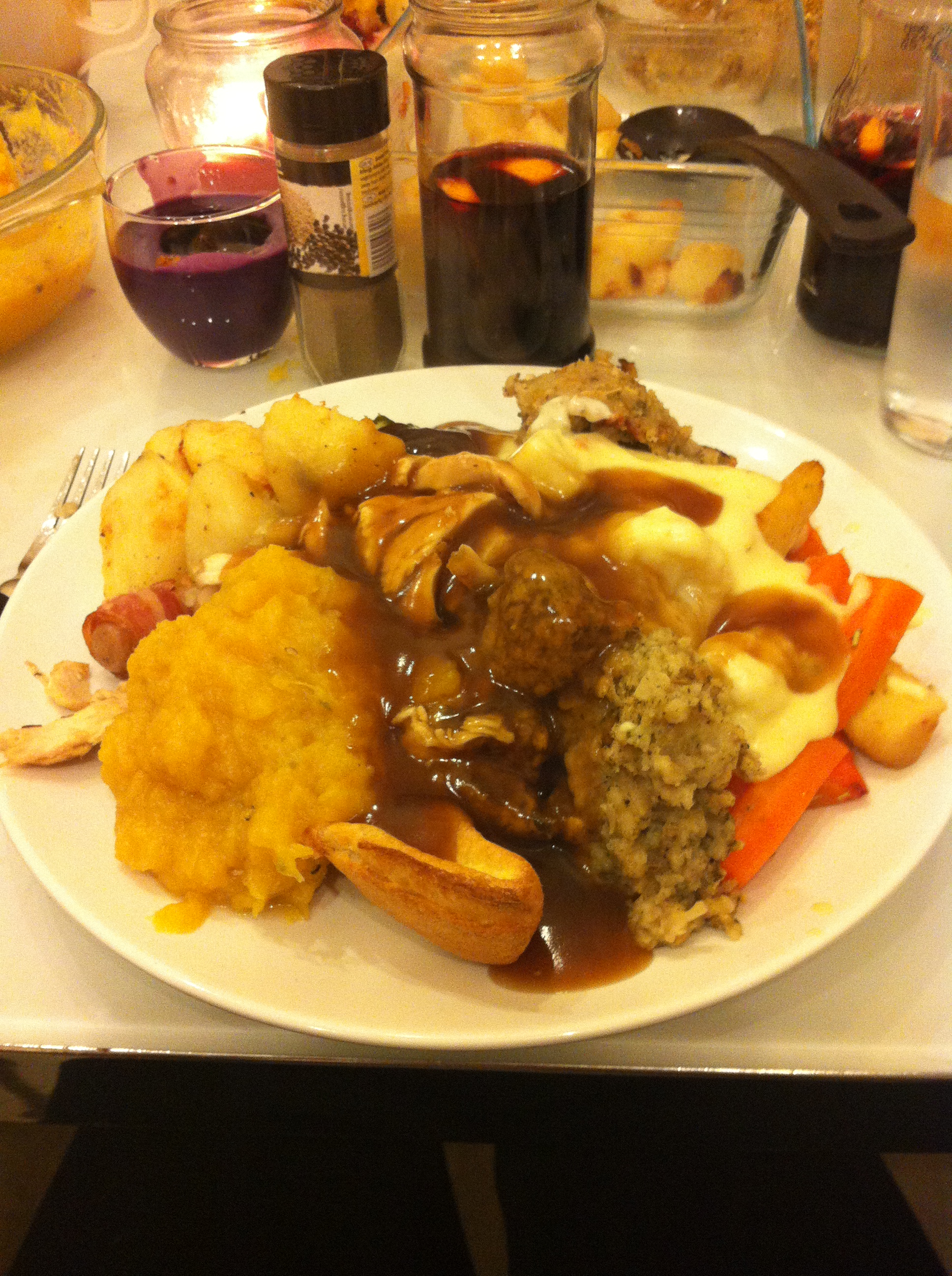 Furthermore, in my third-year, I was chairperson of the university Baking Society which, naturally, demanded I practice regularly. This resulted in me baking gooey and hopelessly rich triple chocolate brownies nearly every week, or whipping up a banoffee pie or some millionaire’s shortbread just because I felt the urge. Although daily food was a nuisance, my girls and I ate plenty of delicious shared meals, one in particular was an extravagant Christmas dinner, of which I ate an unnatural amount and had my first, and hopefully last, experience of genuinely waddling, panting and wiping away food sweats as I left the kitchen.