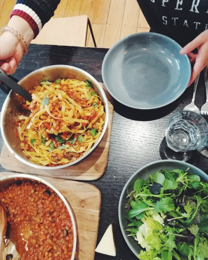 A savoury slurry of olives, sundried tomatoes and puy lentils, served over tagliatelle and sprinkled with basil (and pecorino, for the less strict vegan newcomers). My friend Marie and I scraped the pan clean. Find the recipe here.