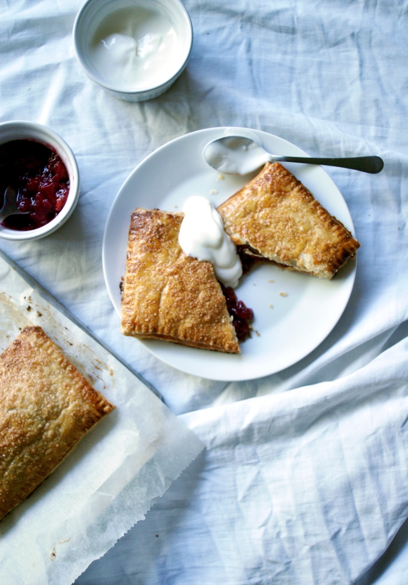 Hand pies are different to turnovers as they are made with two separate pieces of flaky pastry, but like turnovers they look like a bakery masterpiece, all golden and sprinkled in sparkling sugar. Can you believe they look just as perfect when they emerge from your own oven? I was gobsmacked – the recipe was so easy! And it produced professional-looking pastries?! Call me the queen of puff! – and now I’ll be rustling up puff pastry every other weekend.