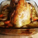 The spice mix is muddled together in a pestle and mortar with olive oil, cider vinegar, honey, fresh ginger, and of course garlic and anchovies because all my talk of originality is just nonsense, and this glossy, spiced, salty sweet marinade in brushed all over the lamb shoulder like polish over a boot. Onto a knobbly bed of chopped potatoes, carrots and onion quarters it’s heaved, then don’t forget as I did to add some chicken stock to the veg. Every hour or so of cooking you can baste the lamb with the stock which will have collected all the juice and drips of marinade.