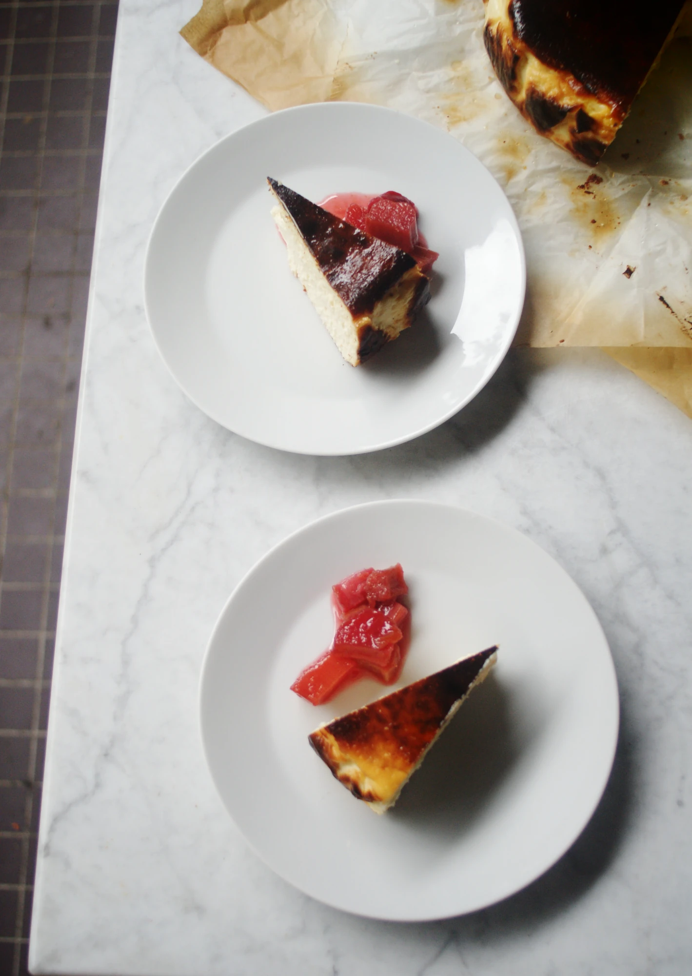 To distract myself, I poached rhubarb. While I yearn to try a chocolate burnt Basque cheesecake, the sourness of seasonal rhubarb is exactly the partner a dessert as unctuous and creamy as this cheesecake needs. After all, it is essentially a slab of dairy on your plate. A sharp fruit is just the ticket, and in this case, rhubarb looks so prettily perfect piled up on top.