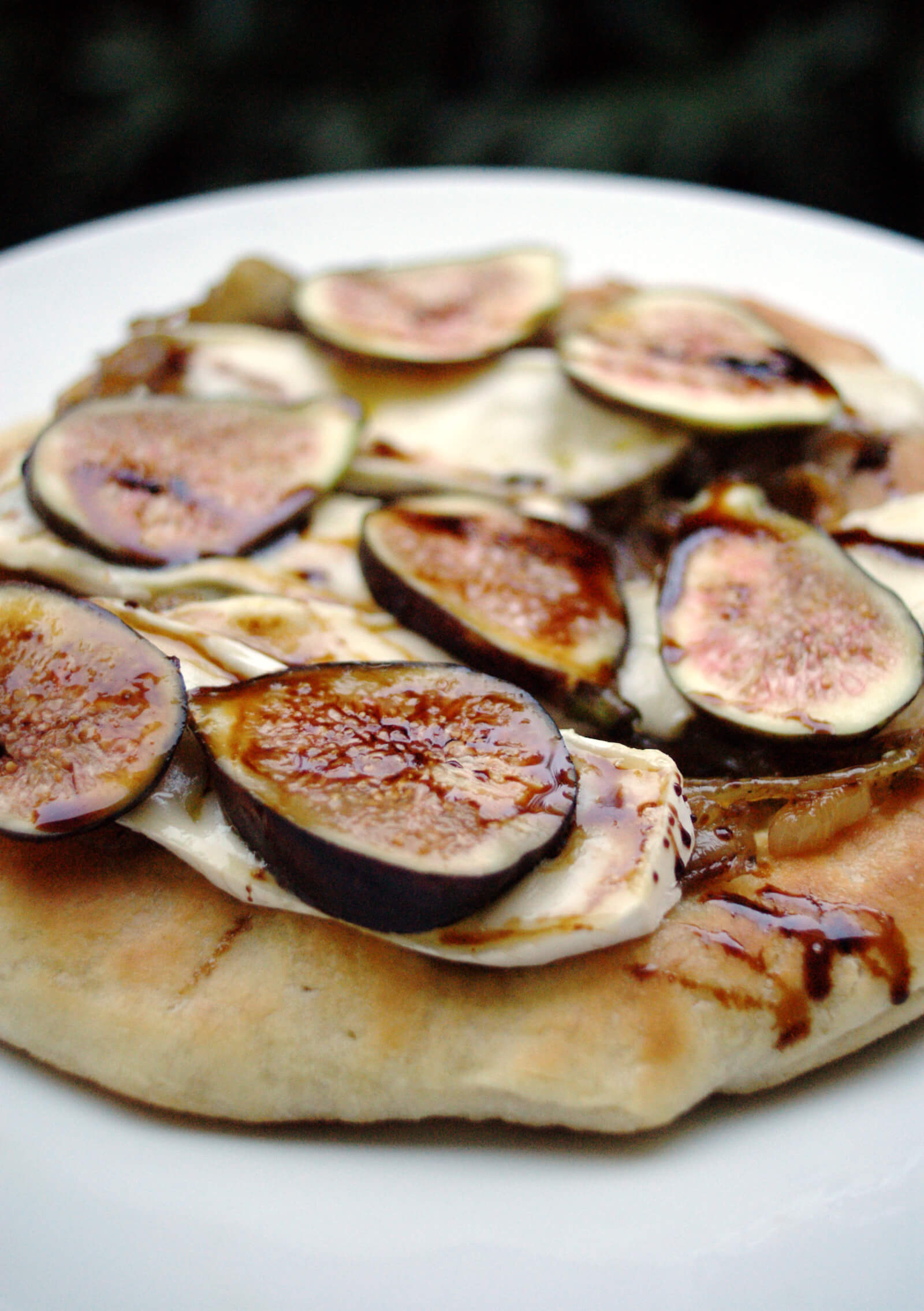 - Slice the figs and brie (if using). Spread a couple of tablespoons of caramelised onions on top of the flatbread, place the brie and fig slices on top and return the flatbread to the grill to melt the cheese – should take 3 minutes or so.